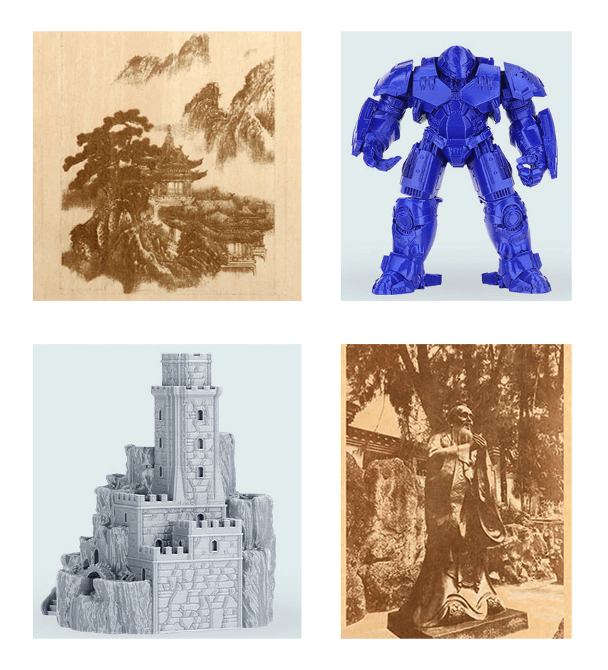 Главное отличие Anycubic Mega Pro от обычных FDM принтеров - наличие встроенного модуля для лазерной гравировки. Функция гравировки позволяет наносить текст или рисунок на кожу, бумагу, картон, дерево или ткань.