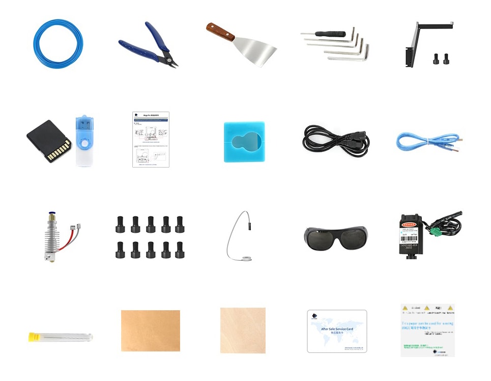 Комплект поставки | Набор инструментов, плоскогубцы, винт М5 * 8, скребок, считыватель карт, лазерная головка, SD - карта, руководство пользователя, защитные очки, шнур питания, USB - кабель, адаптер питания, модуль нивелирования, сервисная катрта |