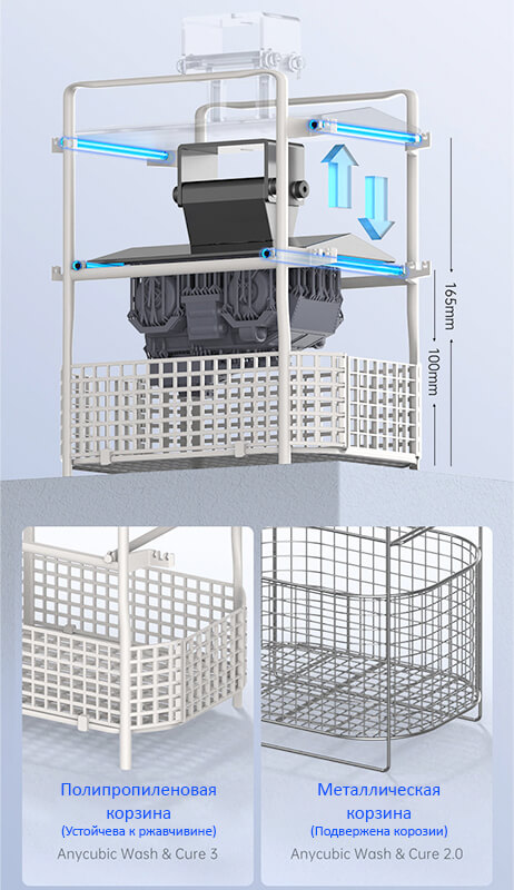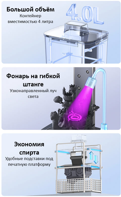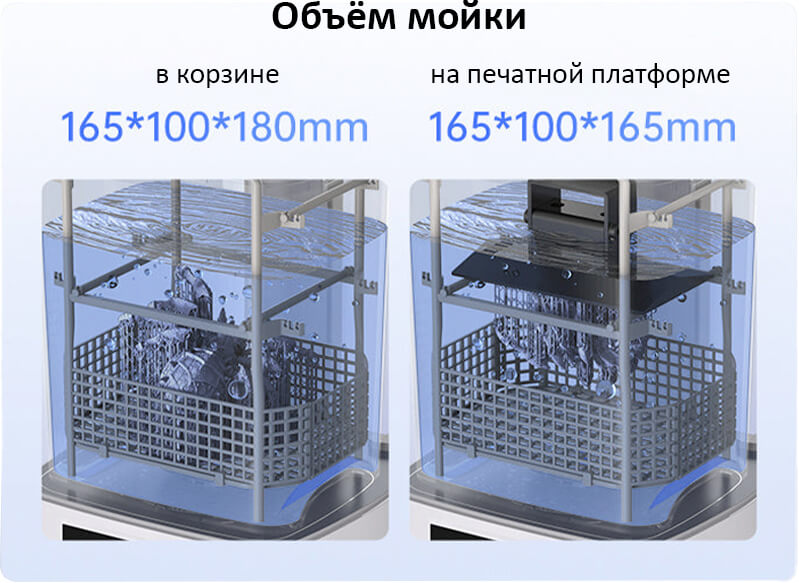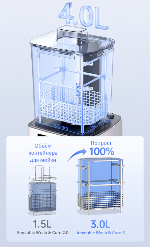 Сравнивая с Anycubic Wash & Cure 2.0, Anycubic Wash & Cure 3 поразителен увеличением ёмкости корзины для очистки на 100%, теперь она составляет 3 литра. Общий объем ведра для очистки расширен до 4 литров. Это идеально подходит для фотополимерных 3D-принтеров.