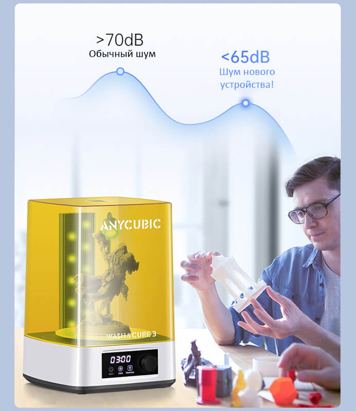 Благодаря более герметичной конструкции и оптимизации программного обеспечения уровень шума, создаваемого при работе в режимах очистки и отверждения, снижен, создавая более тихую и комфортную рабочую среду.