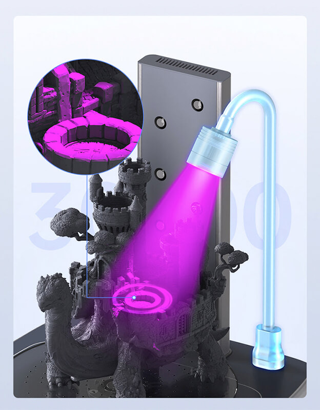 "Инновационное гибкое осветительное устройство Gooseneck" увеличивает энергетическое значение до 30,000uW/cm² в пределах 1-3 см, что значительно усиливает процесс отверждения на сложных участках, таких как верхняя часть моделей и сбоку.