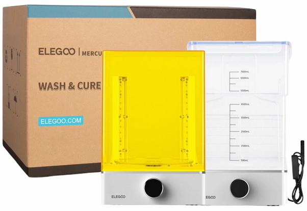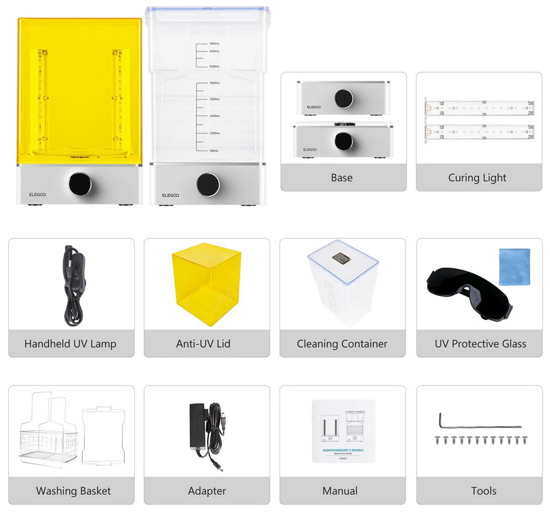 Комплект поставкиПолимеризационная камера (УФ-камера) и Мойка Elegoo Mercury XS (основной корпус); Лампа для отверждения; Поворотный стол для отверждения; Крышка с защитой от ультрафиолета; Емкость для очистки; Корзина для очистки; Кронштейн; Адаптер; Инструменты; Инструкция; Портативная ультрафиолетовая лампа; Защитные очки