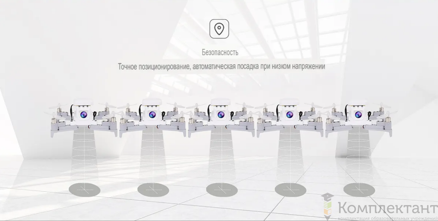 Комплектация | Набор дронов -10 шт STEM / Зарядное устройство для литиевых батарей х 10 / Коврик с QR-кодами х 1 / Маршрутизатор х 1 / Литиевая батарея х 16 / Модуль позиционирования х 10 / Фонари х 10 / Соединительный кабель х 10 / Зарядная база х 10 / Кабель микро-USB х 10 / Ключ для пропеллеров х 1 / Инструкция х 1 / Кейс транспортировочный х 1 / Запасные винты (по часовой стрелке / против часовой стрелки по 2 шт.) х 10 / Запасные моторы (по часовой стрелке / против часовой стрелки по 2 штуки) х 8 / Запасные штифты (стандарт: 100 | половина: 10) х 4 / Руководство |