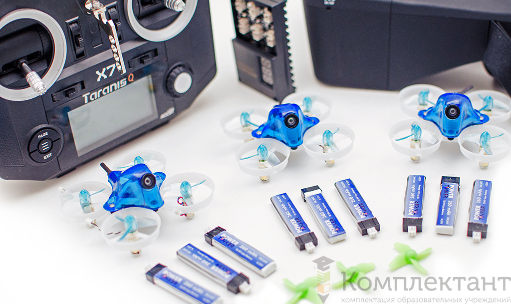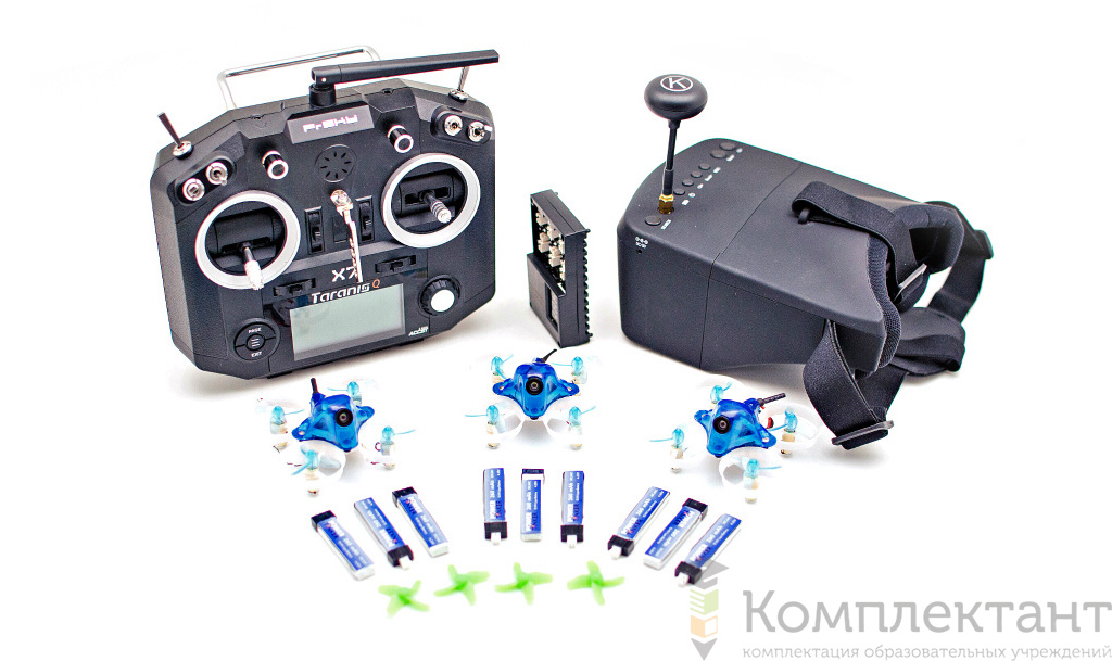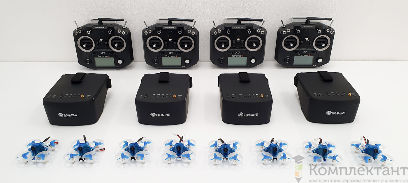 Образовательный набор состоит из восьми готовых к полёту современных мини-дронов, а также комплекта стандартизированных элементов полосы препятствий. Включает электронные версии учебных материалов, набор запчастей, все необходимые инструменты и симулятор для тренировки навыков управления квадрокоптером.