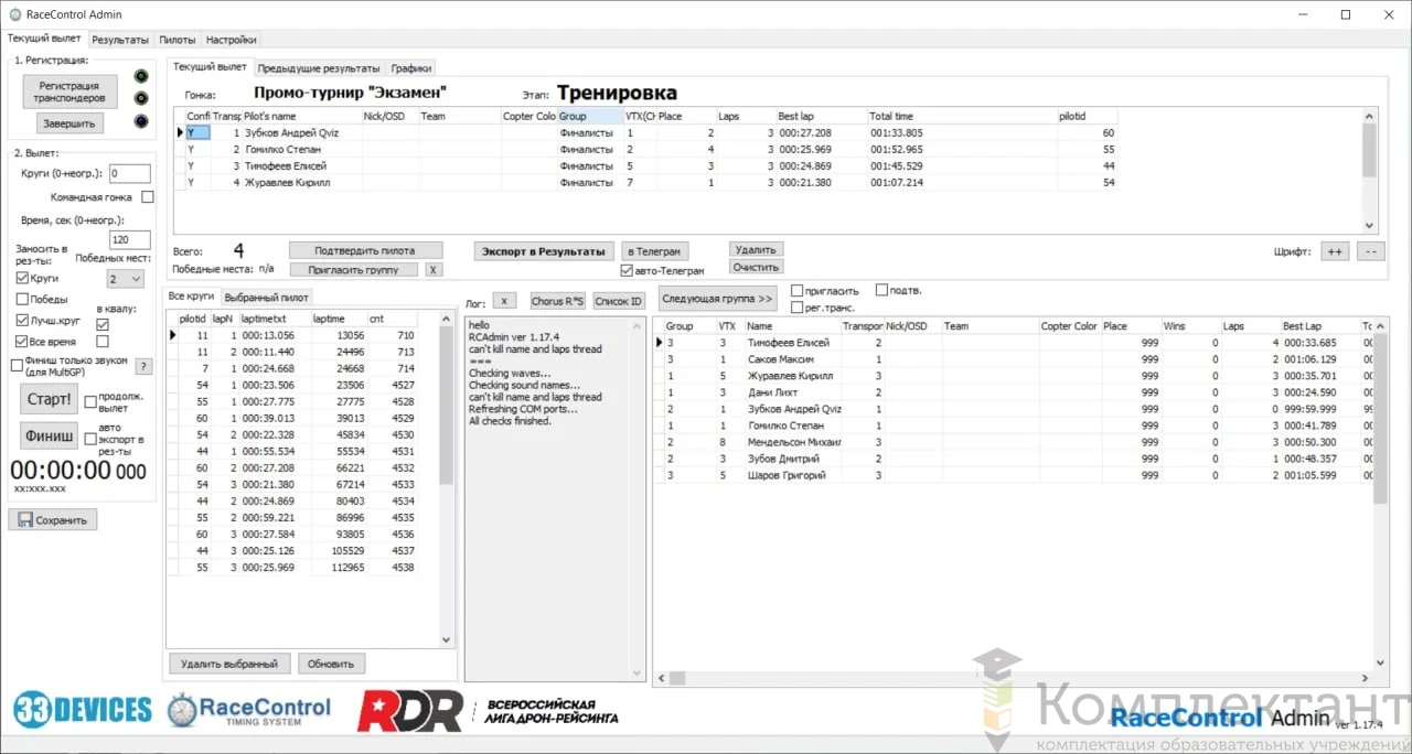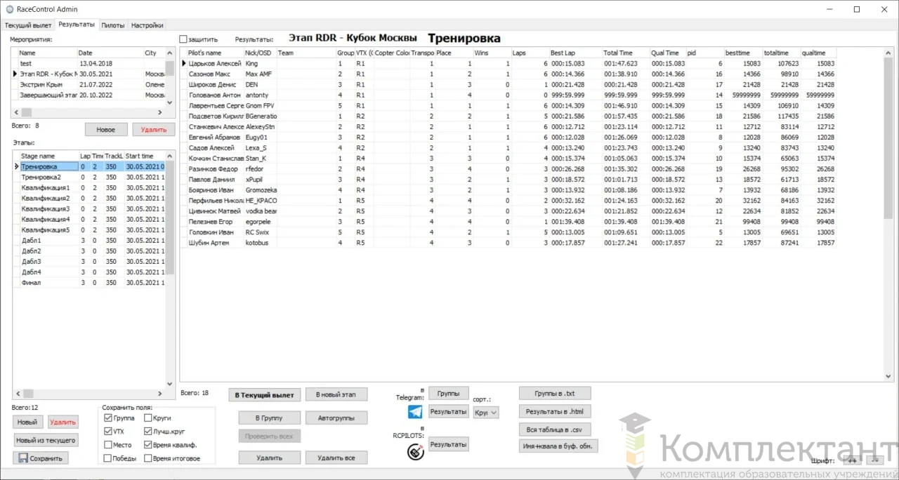 Система хронометража RaceControl была использована практически на всех значимых соревнованиях по дрон-рейсингу начиная с 2017 года (этапы Всероссийского Кубка, серия гонок FPVDudes для начинающих и про, отбор на Чемпионат Европы, Moscow City Games в Лужниках, Армия-2017, РостехДронФест 2019-2020, Экзамены RDR 2022-24, Игры Роспрофжел Фиджитал гонки дронов 2023-24 и так далее). Надежность проверена временем и практикой.