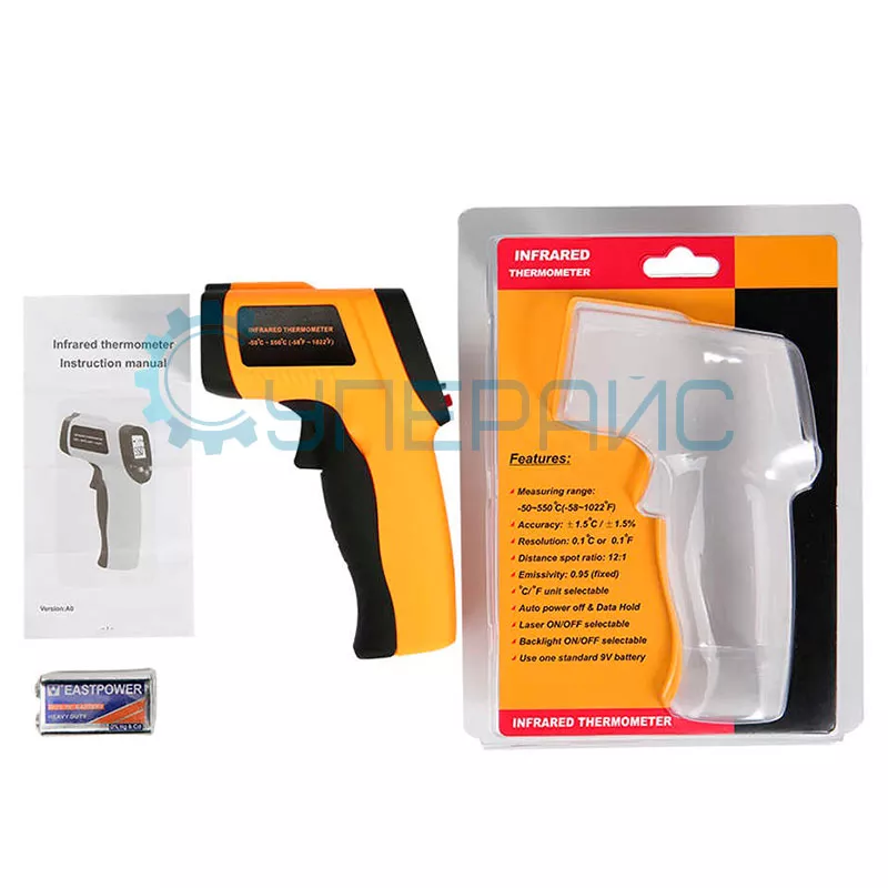 Комплектация | инфракрасный пирометр Benetech GM550 – 1 шт инструкция по эксплуатации – 1 шт батарейка 6F22 "Крона" 9 В - 1 шт |