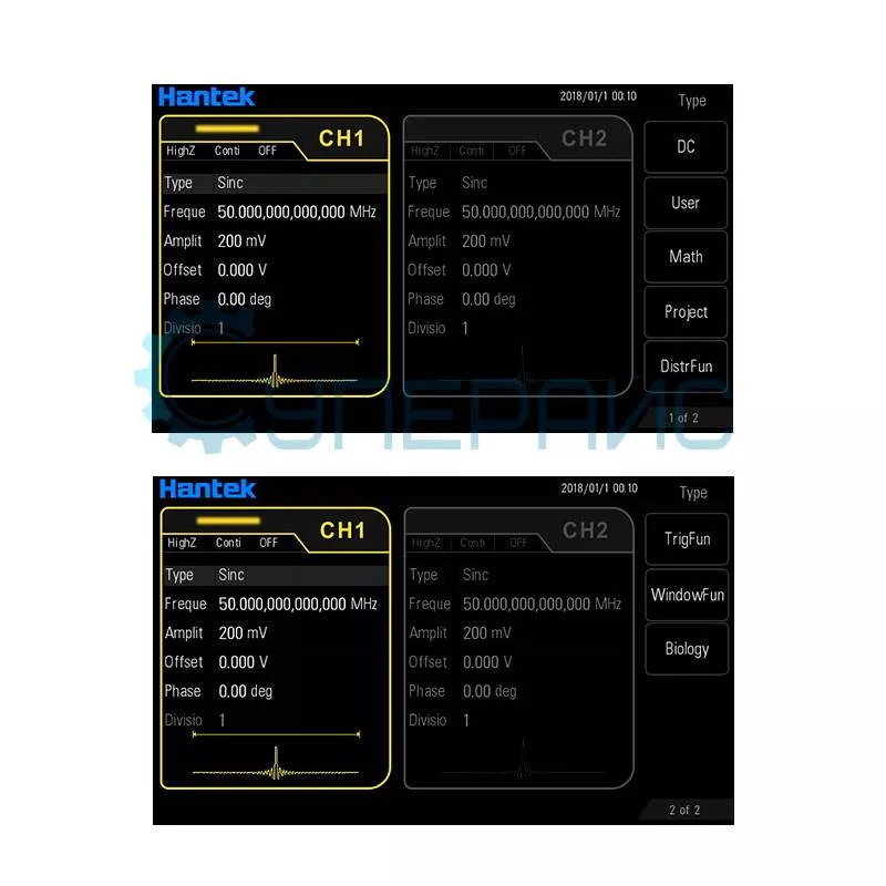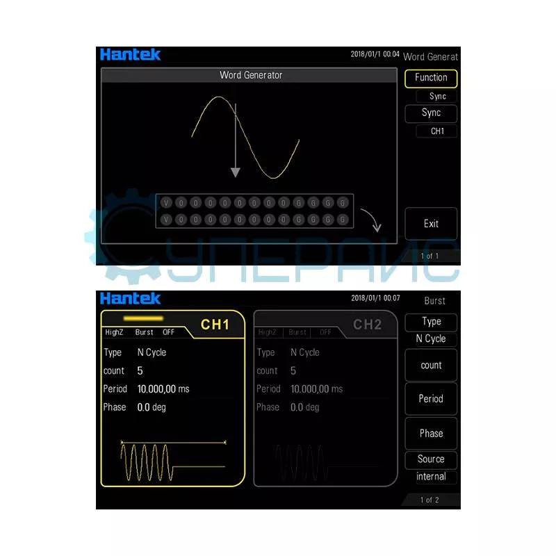 Произвольные формы сигналов | более 160 видов, в том числе Sinc, нарастание/убывание по экспоненте, электрокардиограмма, Гаусса, Haver Sine, Лоренца, тональный сигнал, постоянный ток и т.д. | ||