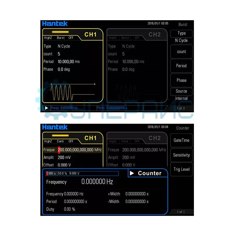 Функция | частота, период, ширина положительного / отрицательного импульса, рабочий цикл | ||