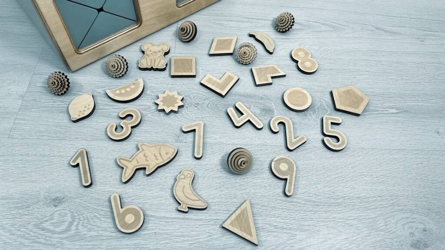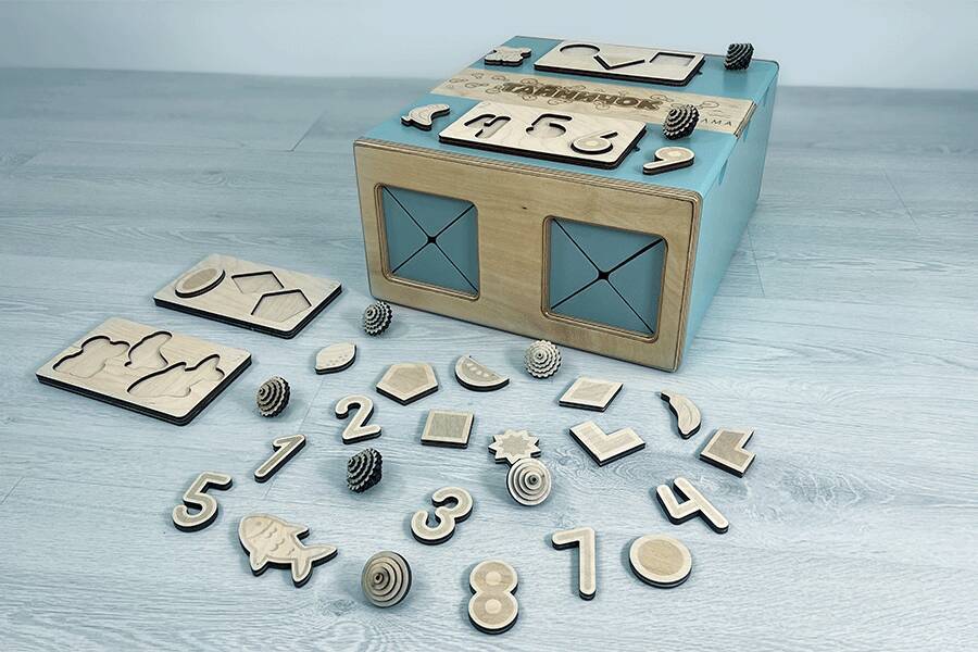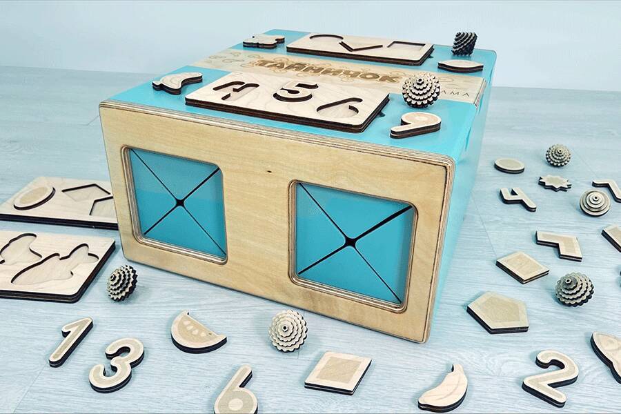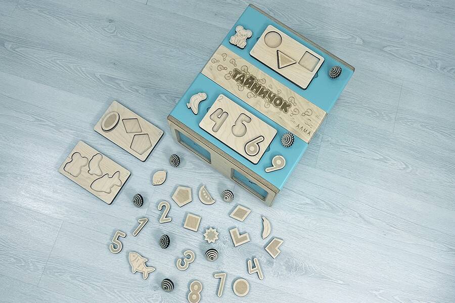 Чтобы тактильные элементы не терялись, хранить их можно внутри самого Тайничка, в специально отведенной зоне в центре ящика. Коробочка плотно закрывается, не давая выпасть содержимому.