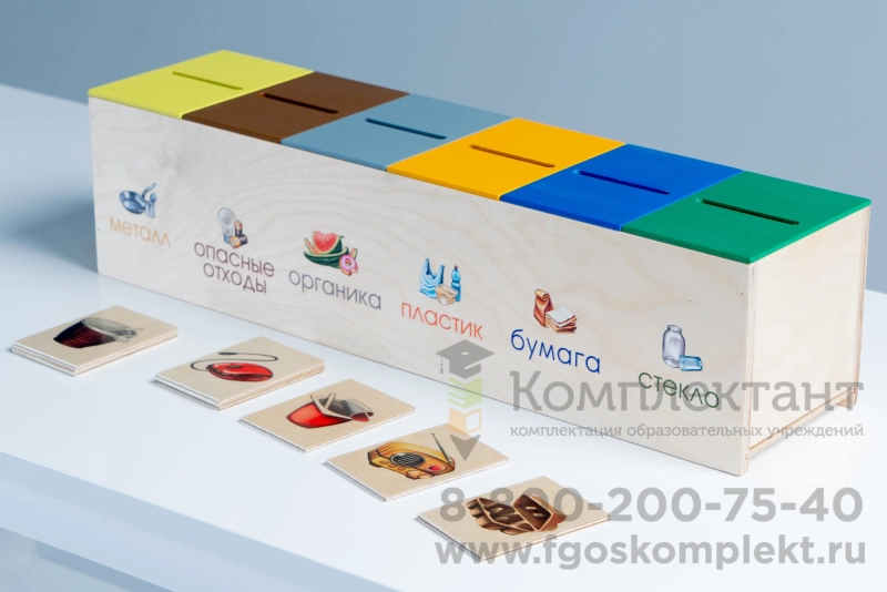 6) Дидактическая игра по сортировке мусора. Комплект контейнеров для сортировки карточек с изображением типов мусора, карточки с изображением мусора – 60 шт.;