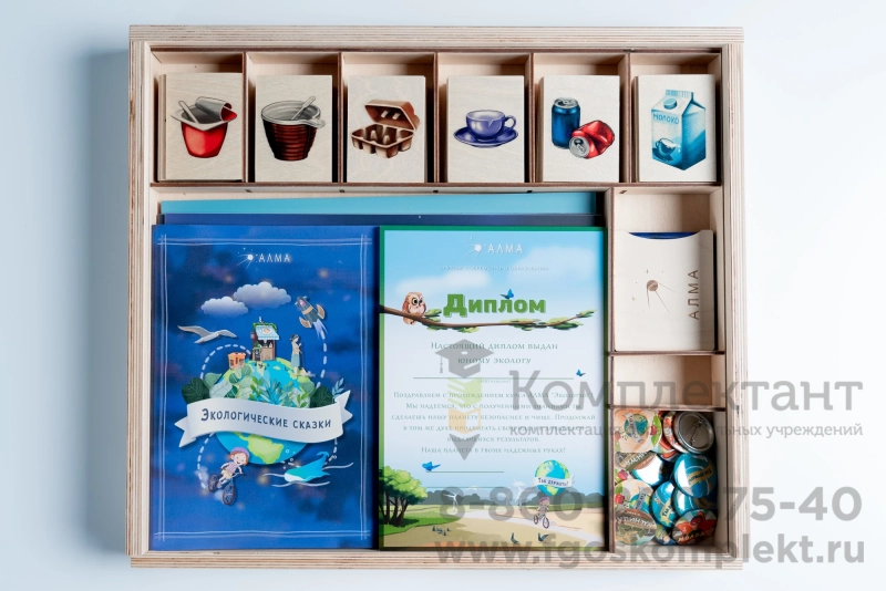 АЛМА «Экология» — это художественно оформленная сенсорная панель с программным обеспечением, а также мотивационные значки АЛМА и дипломы «Юного эколога», сборник экологических авторских сказок, тематические плакаты и комплект деревянных контейнеров и игральных карточек для “сортировки мусора”, карточки для проведения викторины.