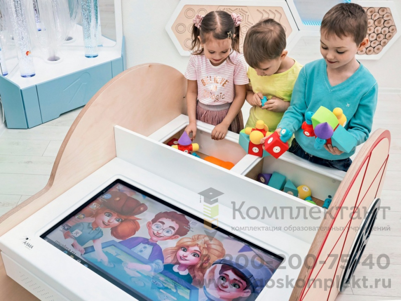 Методический интерактивный комплекс «Машинка» представляет собой многофункциональное игровое пространство с двумя зонами: зоной конструирования и интерактивной панелью для занятий.