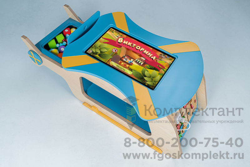 Методический интерактивный комплекс «Вертолет» представляет собой многофункциональное игровое пространство с тремя зонами. Это конструирование, занятия на интерактивной панели и бизиборд.