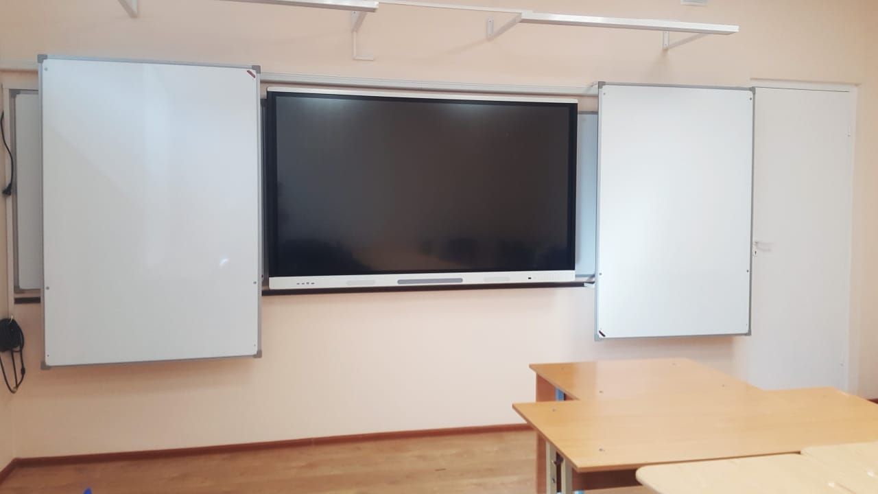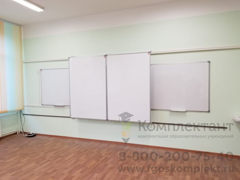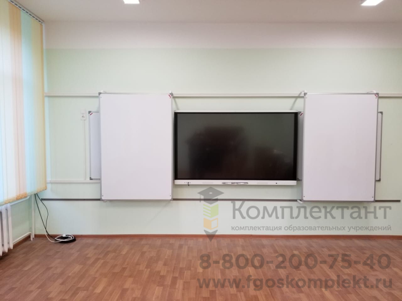 Компания «Комплектант» предлагает решение, позволяющее оптимально разместить 4 меловые доски и интерактивную панель.  При помощи рельсовой системы 2 подвижные доски раздвигаются,  позволяя использовать дополнительную площадь неподвижных.  Интерактивная панель имеют собственную платформу с ОС Android, а также доукомплектована  мощным интегрированным персональным компьютером с Windows 10 Pro для расширения функциональности.