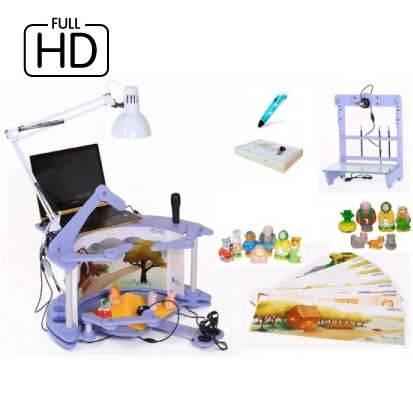 Оборудование для создания анимационных фильмов включает в себя мультстанок для кукольной анимации, дополнительную сцену, лампу на струбцине, web-камеру HD и Full HD, микрофон, комплект тематических фонов, подложку на сцену, фон белый, крепление для ноутбука и методическое пособие ПО АртИгрушка с ключом.