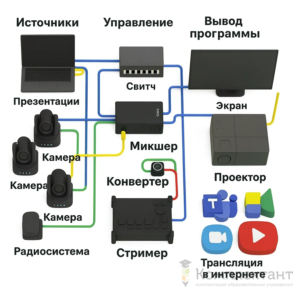 Innovator Streamer Kit — это профессиональный набор оборудования, который обеспечивает качественную трансляцию и управление аудио-видеопотоками. Комплект включает в себя всё необходимое для организации стриминга в школе, колледже, университете или учебном центре.