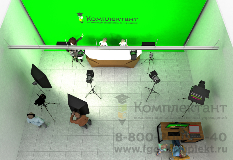 • Хромакей: переносной, зеленый, размеры 100×200 см и 300×300 см.
