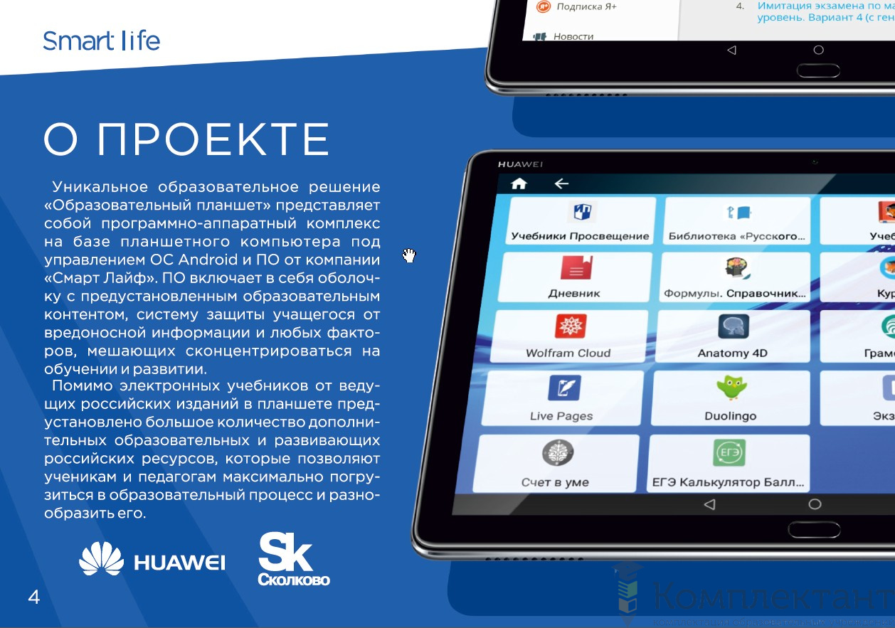 Образовательный планшет для школьная мобильной библиотеки. В состав комплекта цифровой школьной библиотеки входит:- 1 рабочее место на базе планшетных компьютеров - предустановленное специальное программное обеспечение «Цифровая библиотека Smart Life»  - цифровой контент (более 2 500 электронных книг классической литературы на базе электронной библиотеки ЛитРес:Школа).
