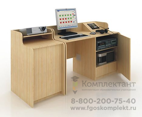 Все оборудование, персональный компьютер преподавателя и аудио-аппаратура встроены в специальный стол преподавателя, с ящиком под внешние аудио- источники и учебные материалы. В нерабочем состоянии вся аппаратура закрывается на ключ. Пульт управления классом оснащен панелью с возможностью регулировки уровня сигнала программ по 3 каналам, а также тумблером общего включения/ выключения класса. Для мультимедийного обурудования предусмотрена специальная тумба.