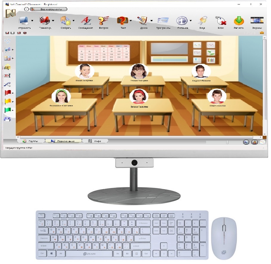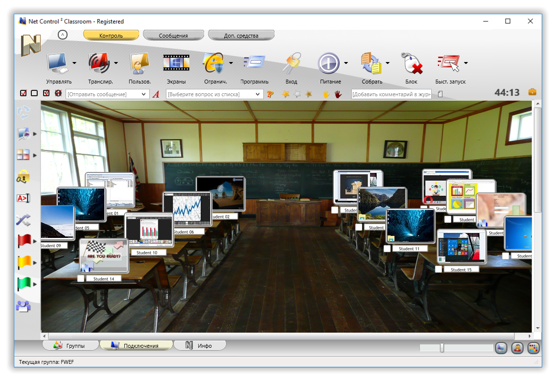 • Мониторинг учащихся в режиме реального времени, с возможностью просмотра компьютеров учащихся в виде эскизов или полноэкранном режиме, в режиме совместного управления.