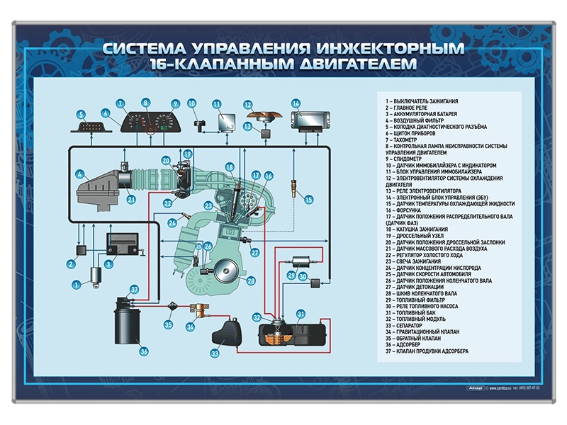 Стенд представляет собой информационную панель, на которой размещены сведения об общем устройстве и принципе работы системы управления инжекторным 16-ти клапанным двигателем автомобиля, содержащие схему системы с перечнем оборудования.
