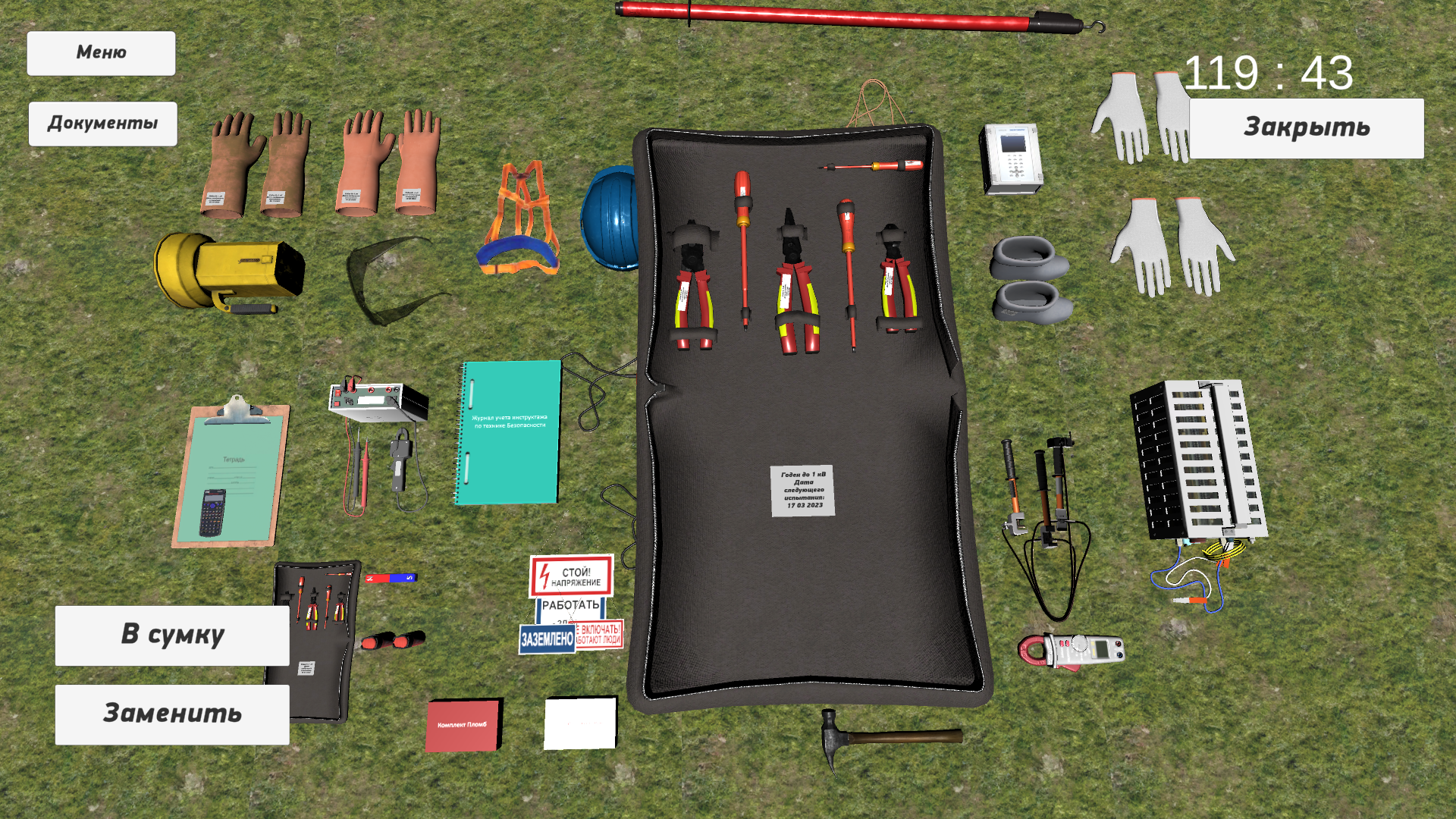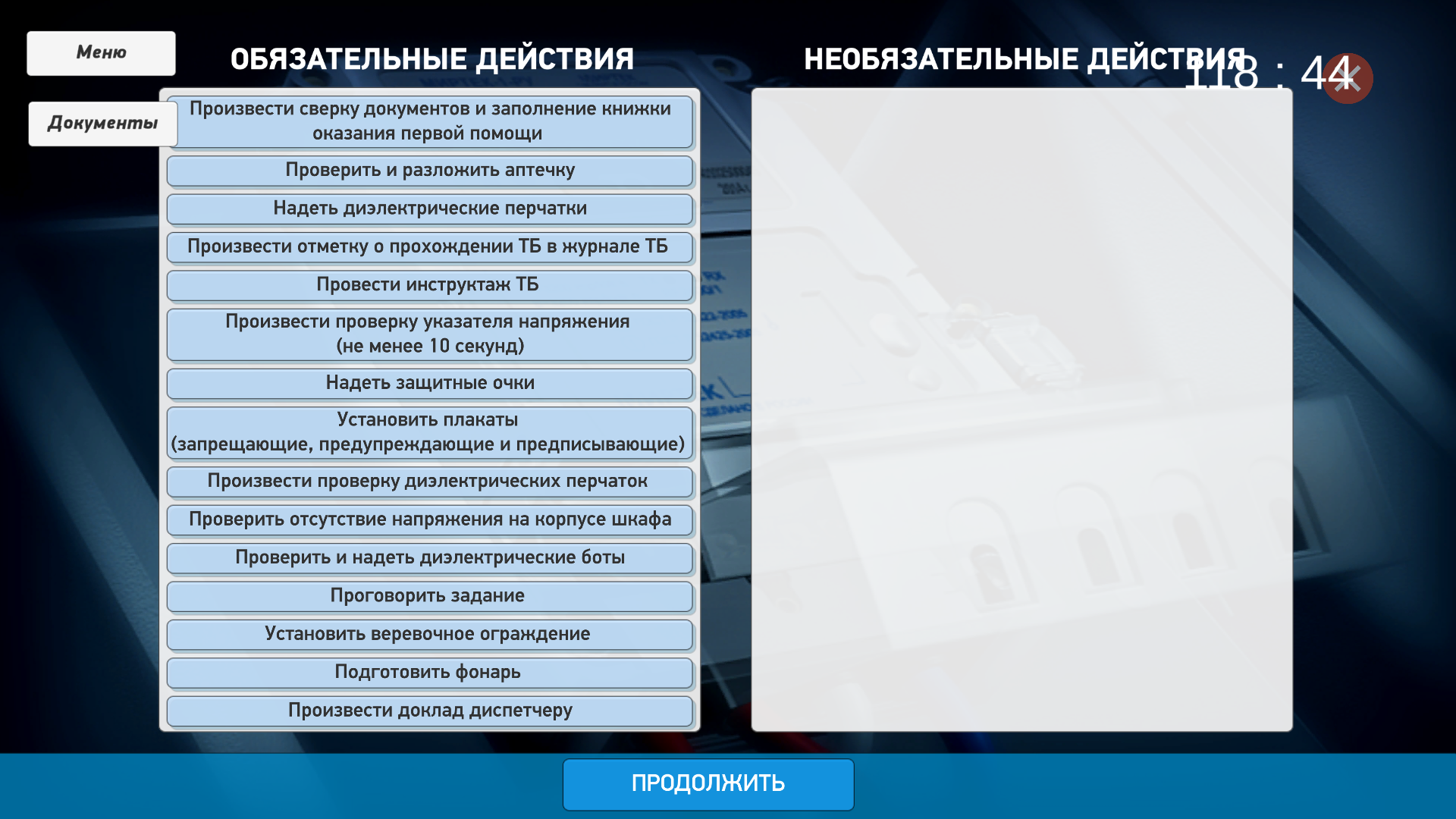 В режиме экзамена пользователь без подсказок воспроизводит правильную последовательность действий по монтажу и проверке трехфазного счетчика. По завершении экзамена выводится автоматический отчет с указанием затраченного времени и количества правильных и неправильных действий.