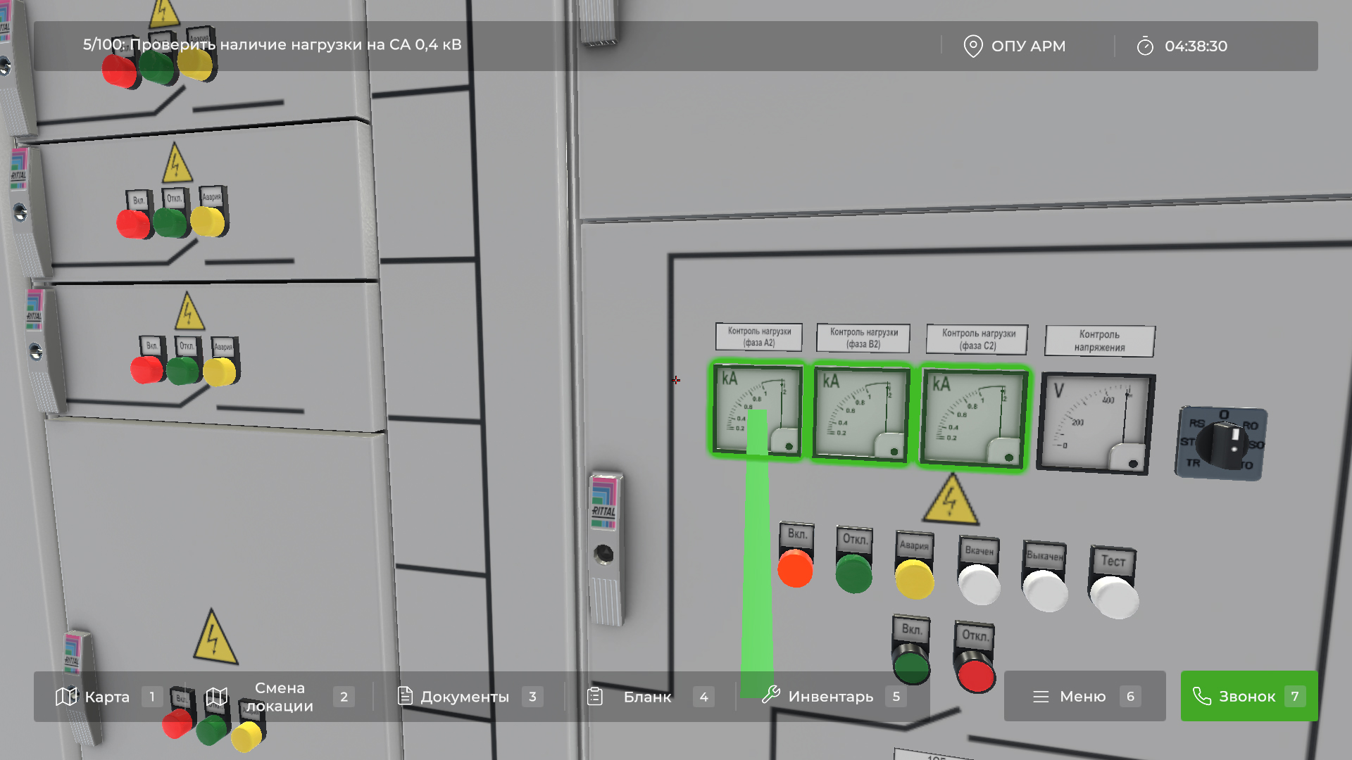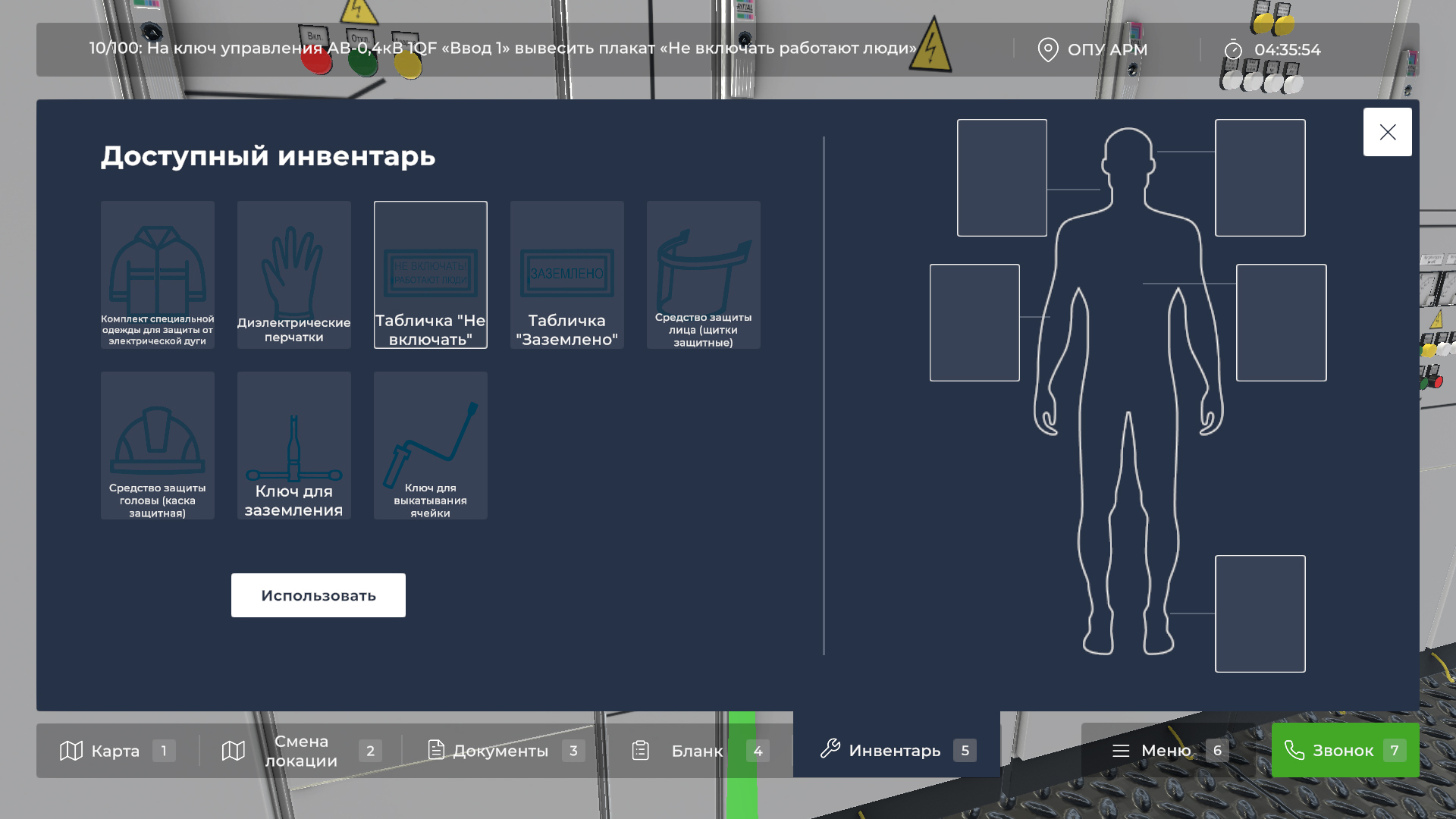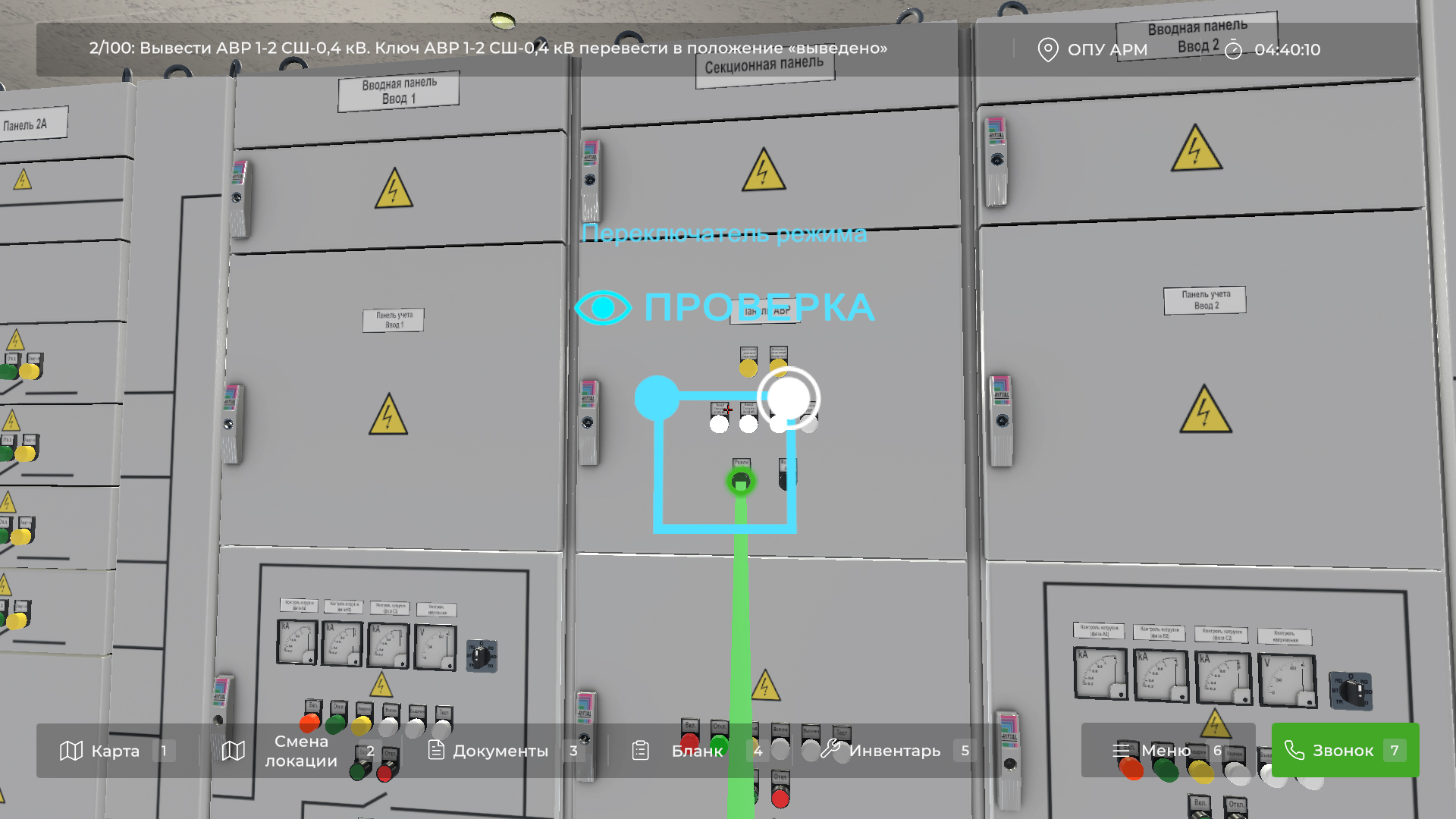 В режиме экзамена пользователь воспроизводит правильную последовательность действий по выводу в ремонт секции шин 10(6) кВ в соответствии с бланком переключений без подсказок и без возможности допустить критическую ошибку.