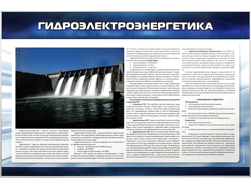 Стенд представляет собой информационную панель, на которой размещена обучающая информация, дающая представление об основных понятиях по теме "Гидроэлектроэнергетика".