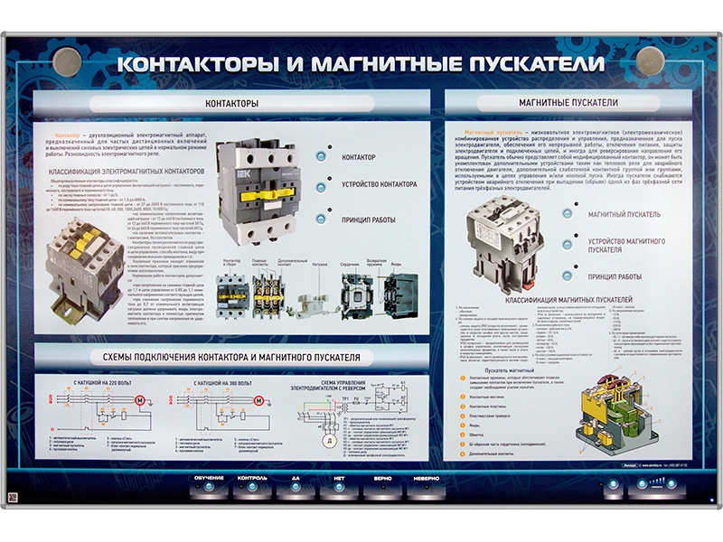 Электрифицированный стенд "Контакторы и магнитные пускатели" представляет собой полноцветную светодинамическую панель, на которой отображена информация о назначении и функциях контакторов и магнитных пускателей. Представлены схемы включения, принципы работы, классификация.