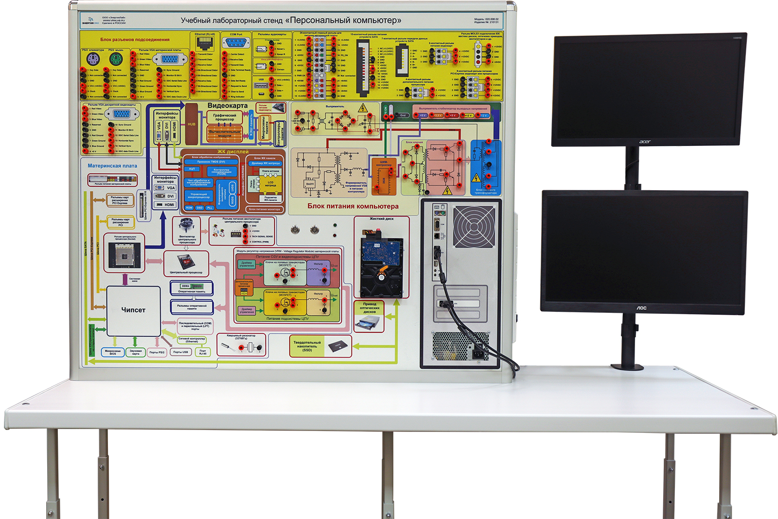 Стенд предназначен для изучения принципов работы персонального компьютера, его составных частей и обеспечивает полноценную работу в качестве рабочей станции (ПЭВМ), а также для имитирования и поиска неисправностей.
