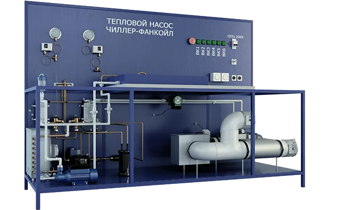 Стенд "Тепловой насос с системой кондиционирования воздуха" демонстрирует принципы работы оборудования для отопления и охлаждения помещений. Идеально подходит для учебных заведений, обеспечивая наглядное представление о современных технологиях энергоэффективности.