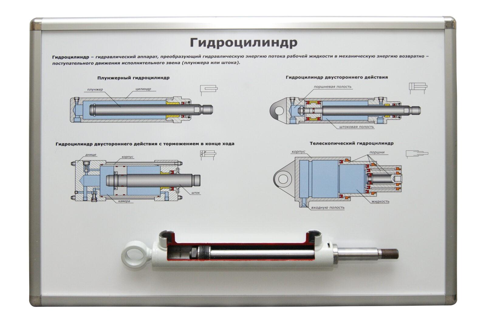 3) Учебный плакат-стенд справочный: конструкции и схемы работы гидроцилиндра, гидроцилиндр в разрезе.