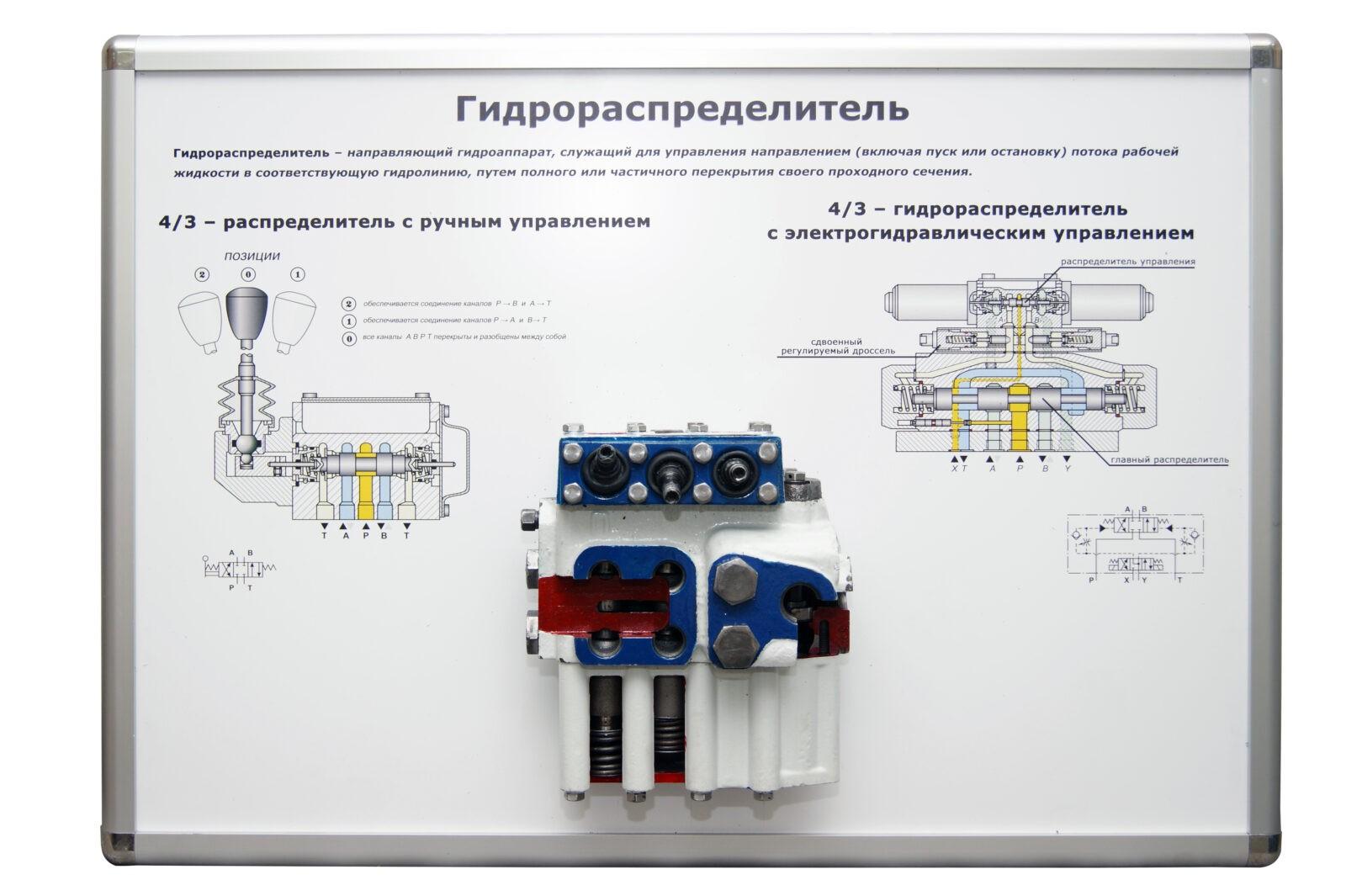 1) Учебный плакат-стенд справочный: конструкции и схемы работы гидрораспределителя; гидрораспределитель в разрезе.