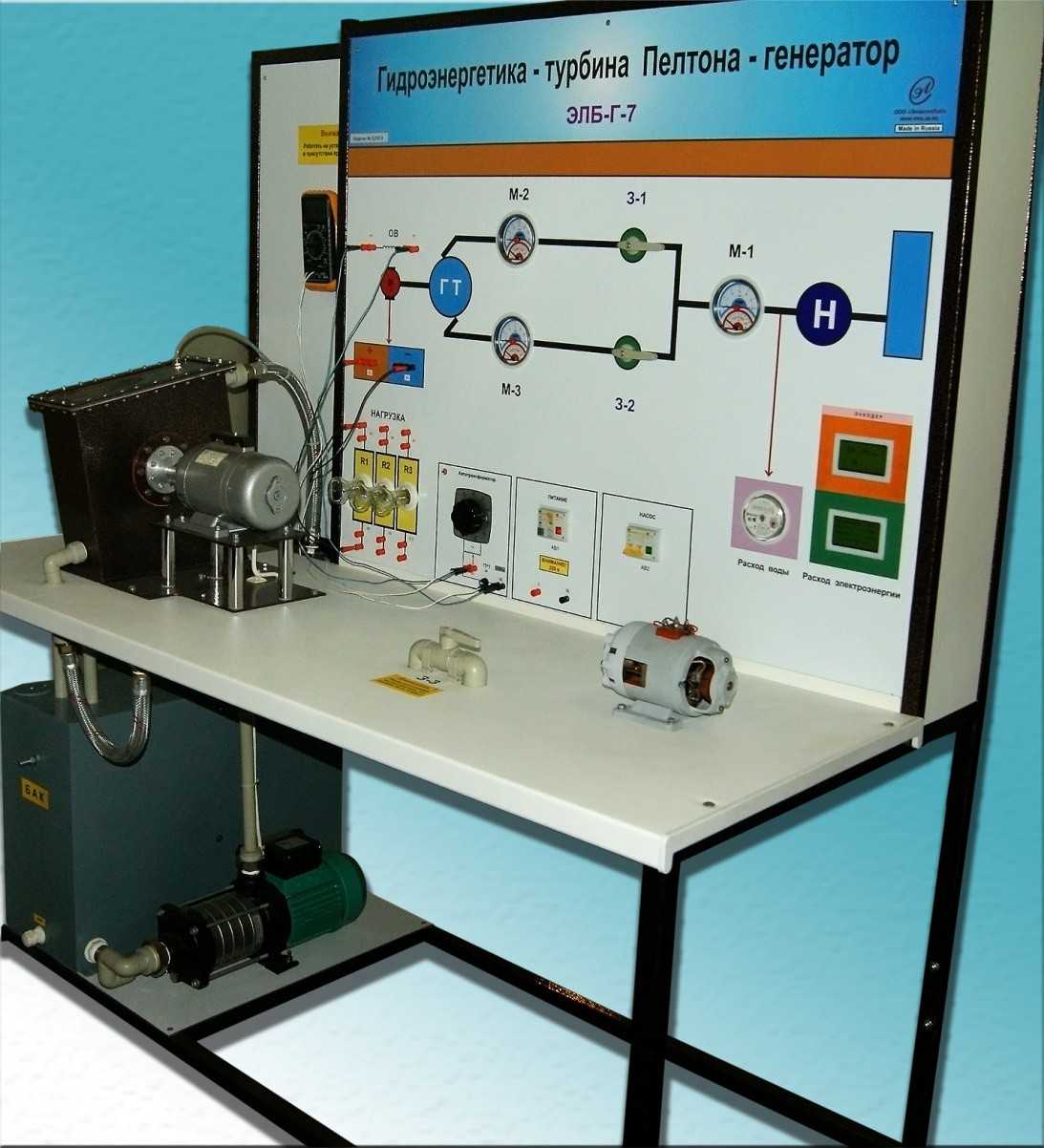 Выполнен в виде настольной конструкции, состоящей из основания, на котором размещены бак водяной, насосный агрегат подачи воды в систему турбина Пелтона-генератор, панели управления и измерения, кальной стойки, выполненной из металла с порошковым покрытием. Модуль создания нагрузки на генератор предусматривает различные схемы соединения нагрузки: параллельное, последовательное и смешанное. На панели управления турбиной установлены приборы, показывающие расход потока воды, поступающий в турбину и напор потока на входе в турбину.