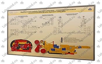 Назначение: Стенд-планшет электрифицированный светодинамический предназначен для изучения принципа работы проходческого комбайна бурового действия (планетарно-дисковые исполнительные органы), кинематики движения основных его элементов, принципов действия силовых систем горной техники.