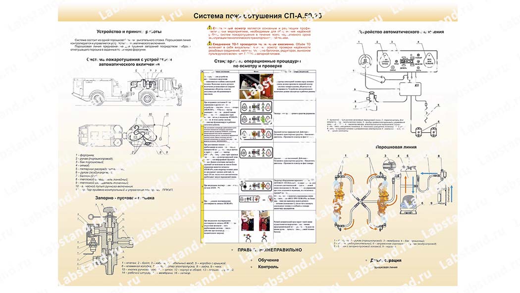 Светодинамический стенд-планшет предназначен для освоения учебного материала на тему: системы пожаротушения мобильной техники, в профильных учебных заведениях.