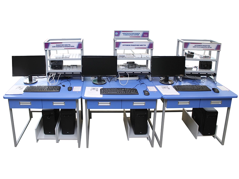 Комплект представляет собой три самостоятельных рабочих места организованных на лабораторных столах. Рабочие места оборудованы персональными компьютерами и настольными стойками с размещенным сетевым оборудованием. Комплект предназначен для одновременной работы группы до 3-х человек.
