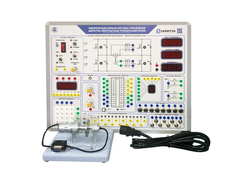 Комплект учебно-лабораторного оборудования предназначен для проведения лабораторно-практических занятий по курсам "Микропроцессорные системы управления", "Системы управления электроприводов" и "Прикладное программирование" с целью изучения микропроцессорной системы управления двигателем постоянного тока по схеме "Широтно-импульсный преобразователь - Двигатель постоянного тока" и приобретения навыков программирования микроконтроллеров.