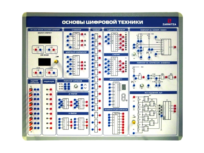 Стенд представлен в моноблочном исполнении, содержащим блок питания, генератор импульсов прямоугольной формы; элементы индикации и управления; логические элементы и триггеры, счетчики, дешифраторы, сумматор, АЦП.
