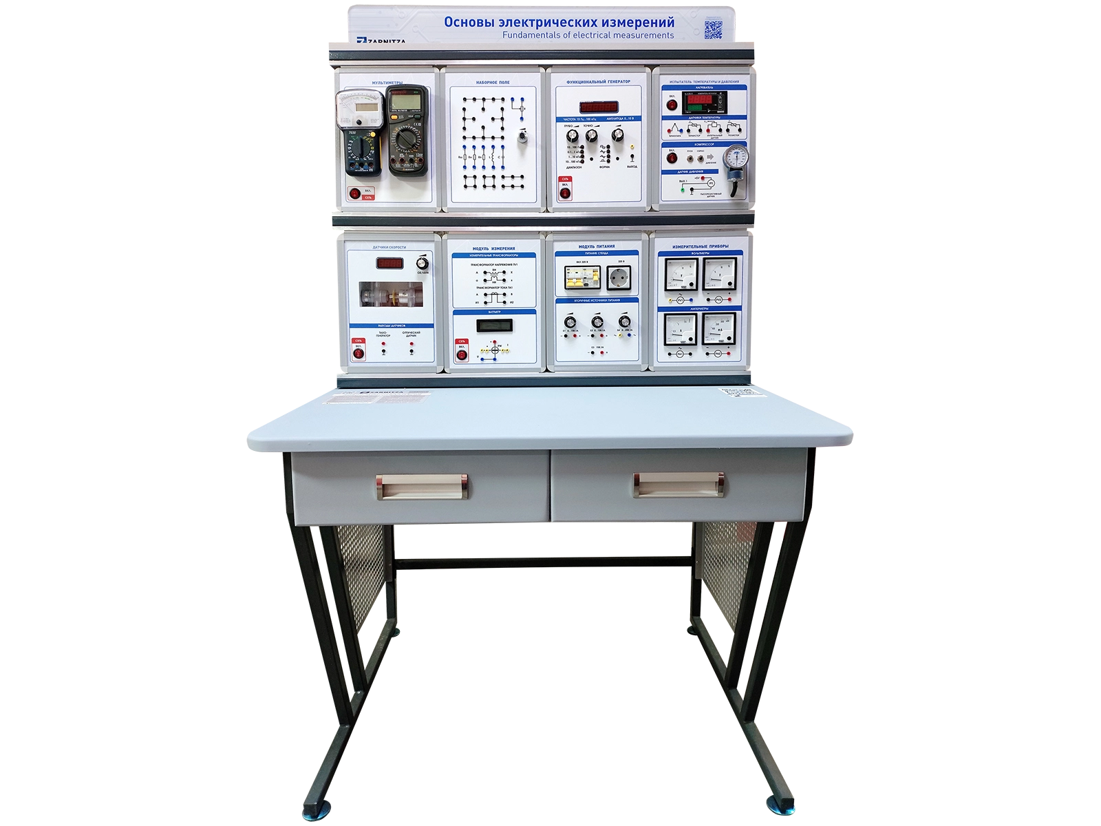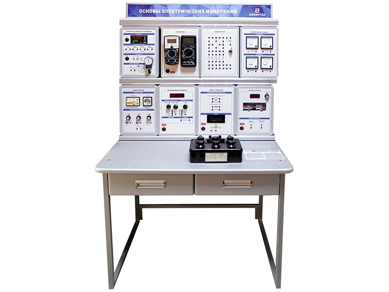 Комплект учебно-лабораторного оборудования "Основы электрических измерений" предназначен для изучения аналоговых и цифровых измерительных приборов (калибровка, прямые и косвенные измерения, расширение пределов измерения, погрешность измерения), приобретения практических навыков измерений электрических величин в цепях постоянного и переменного тока (ток, напряжение, сопротивление, мощность), а также для изучения датчиков скорости, температуры и давления.