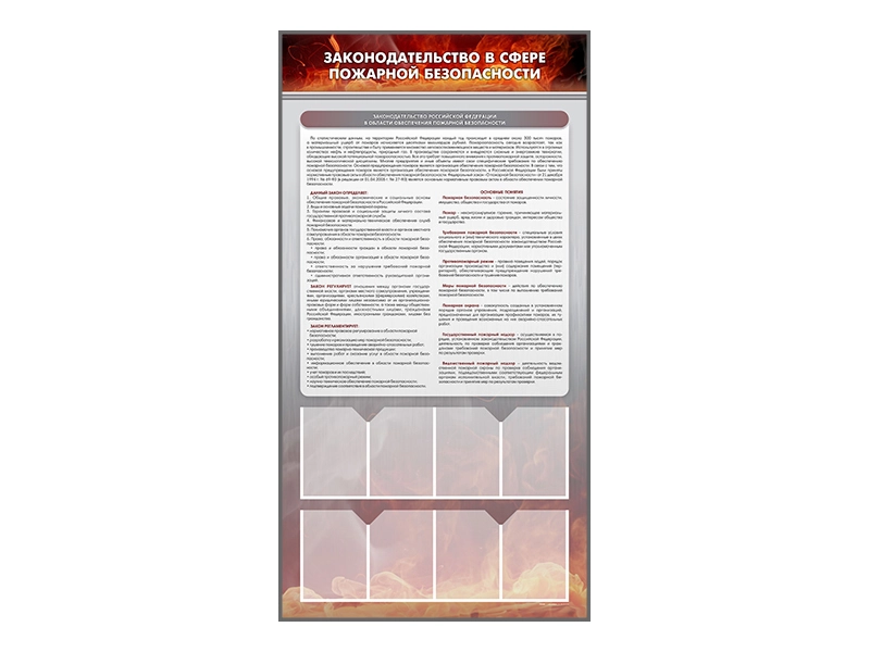 Стенд-уголок предназначен для наглядного отображения информации о законодательстве в сфере пожарной.