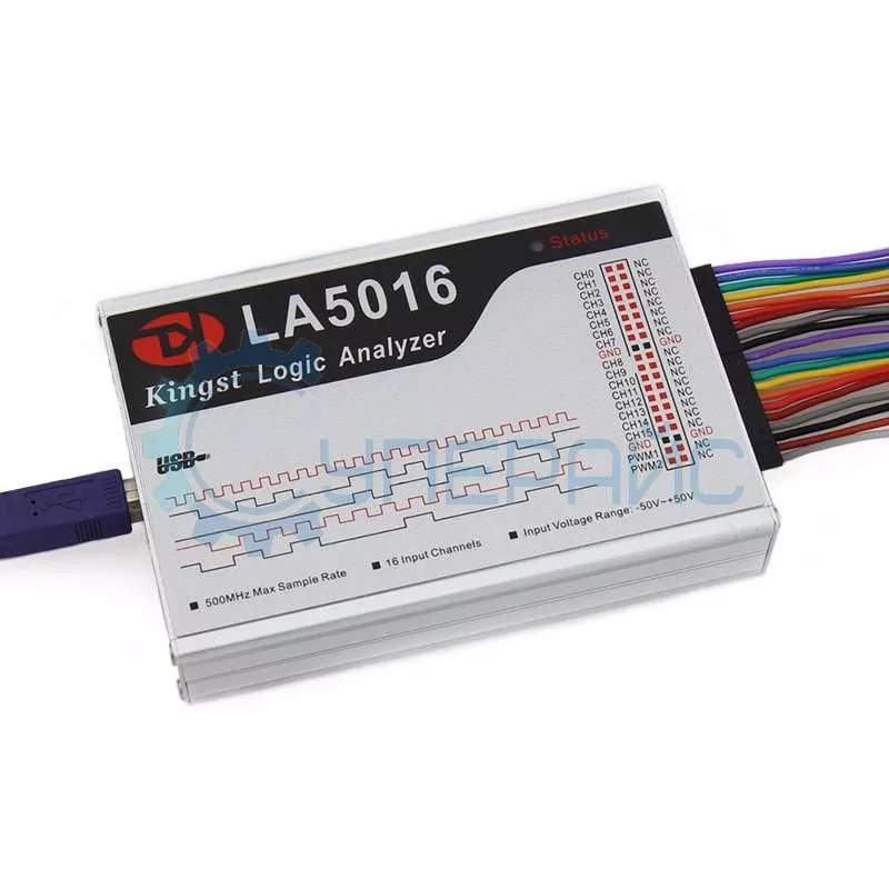 Логический анализатор KINGST LA5016 - это портативный прибор с питанием по USB, обладающий широкими возможностями по записи и анализу цифровых сигналов. Он удобен в применении и имеет продуманный, интуитивно понятный интерфейс управления. Для использования логического анализатора необходимо скачать и установить на компьютер специальное программное обеспечение для работы с устройством, позволяющее проводить динамический анализ полученной информации с каналов передач. Логический анализатор KINGST LA5016 имеет 16 входных каналов с частотой дискретизации до 500 МГц, а также буфер длиной 1Гб выборок на канал, обеспечивающий высокую точность временных измерений довольно больших потоков данных. Прибор поставляется с необходимым набором шлейфов и зажимов для подключения к объекту тестирования.