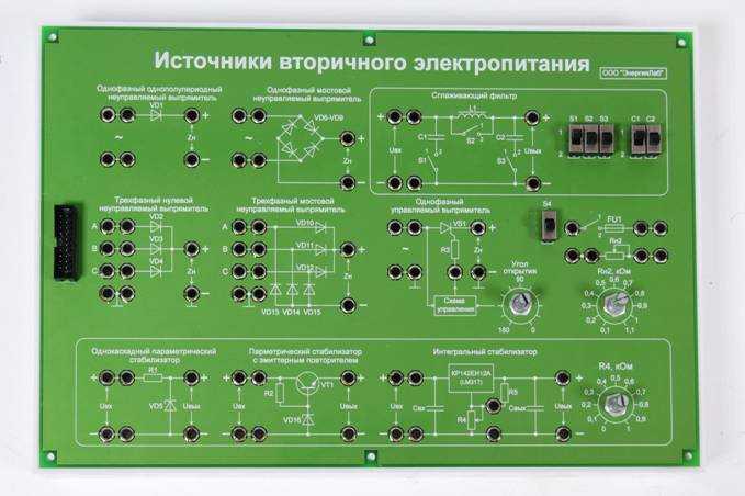Сменная панель содержит различные виды выпрямителей, фильтр, нагрузку а также различные виды стабилизаторов напряжения.