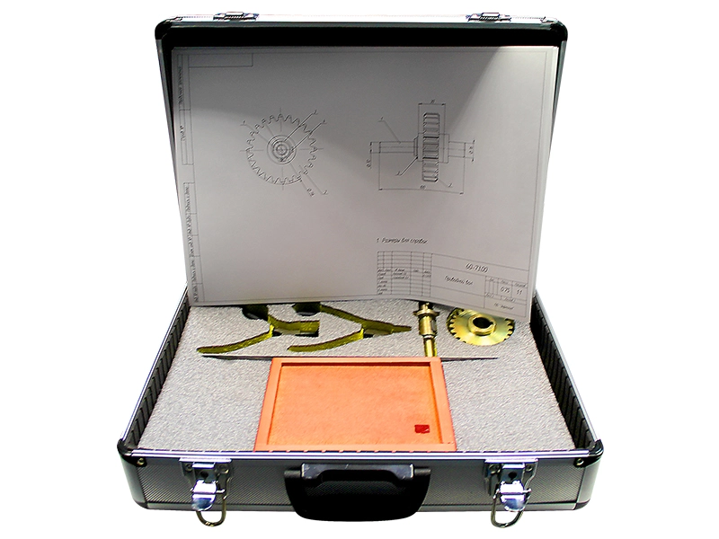 Комплекс представляет собой кейс с комплектом, состоящим из шестерни, закрепленной на валу с помощью стопорного кольца и шпонки (соединение вал-шестерня), наборов слесарных и измерительных инструментов и комплекта чертежей элементов устройства.