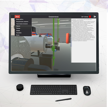Тренажер предназначен для изучения котельного оборудования тепловых электрических станций. Позволяет выводить на экран анимированные 3D модели оборудования, трехмерные разрезы основных элементов котельной установки, более наглядно отображать принцип работы системы, с возможностью мониторинга рабочего процесса.