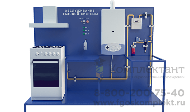 Учебный стенд по обслуживанию газовой системы на 2 потребителя: плита (с вытяжкой) и котел