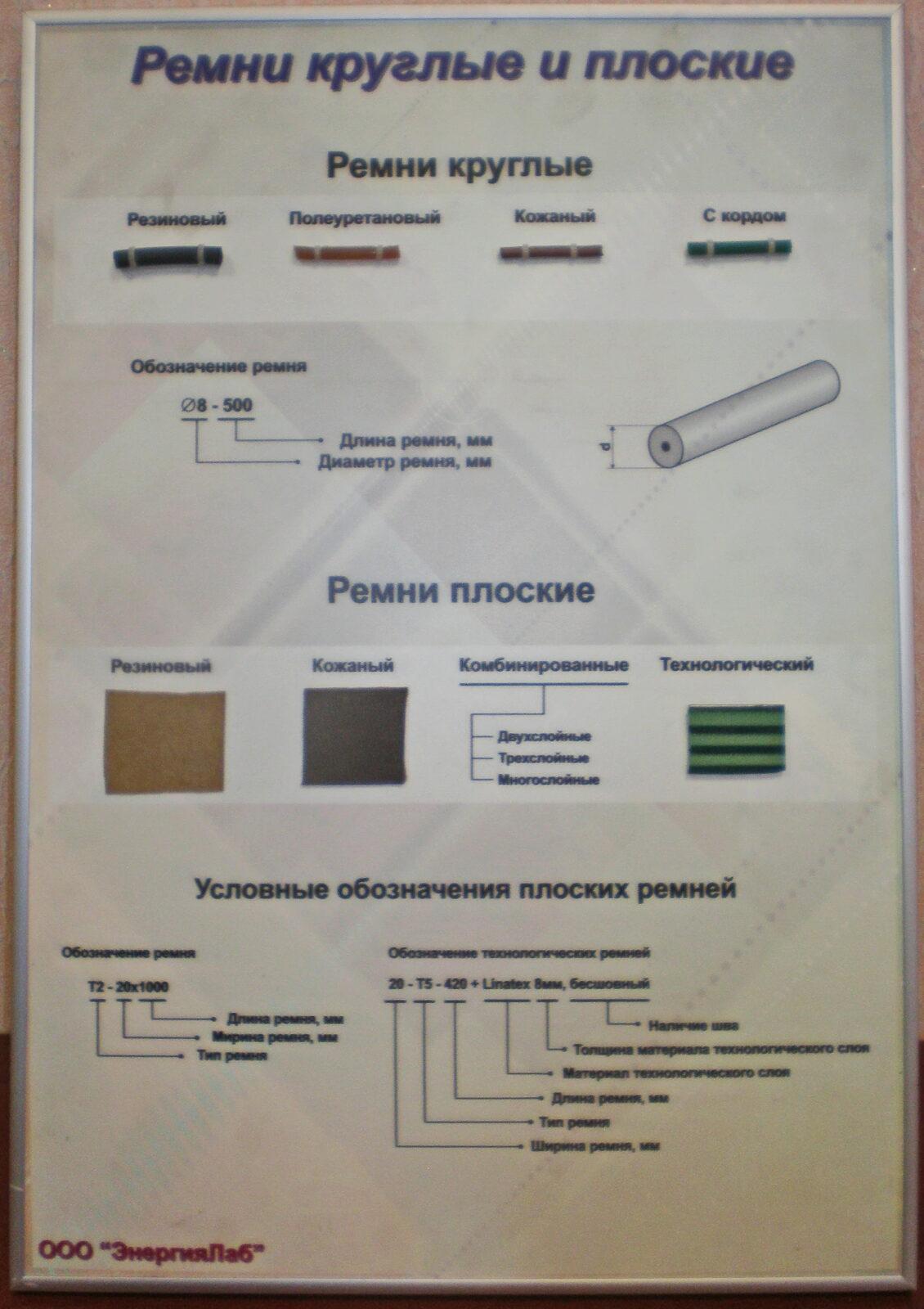 Планшет формата А2 с возможностью использования в настенном и настольном вариантах. На планшете размещены классификация, условные обозначения и образцы ремней плоских и круглых в натуральную величину, а именно: