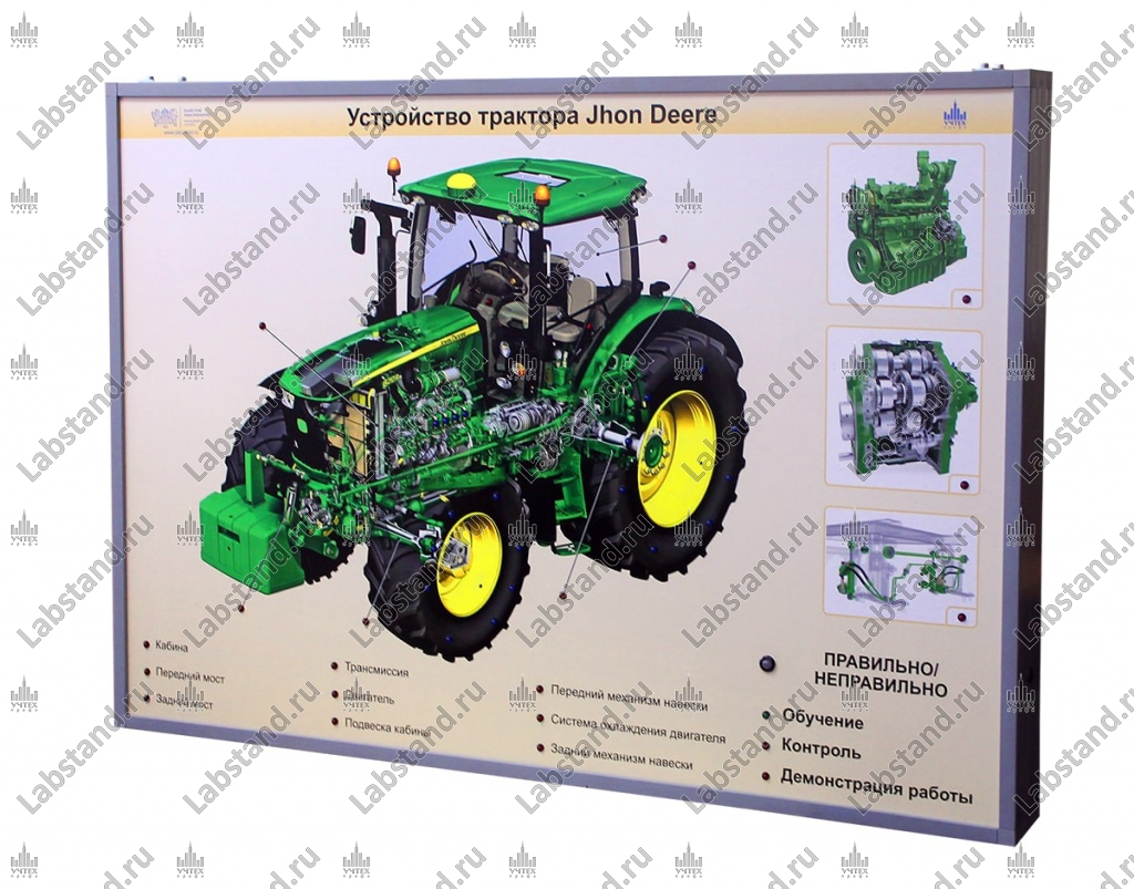 Состав: Стенд-планшет светодинамический ««Устройство трактора Jhon Deere»», паспорт, магнитная указка, блок питания с рабочим напряжением 220 В.