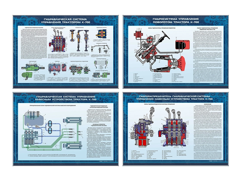 Комплект стендов «Гидросистемы тракторов» представляет собой комплект информационных панелей, на которых размещены рисунки, схемы, таблицы, графики и формулы по курсу "Устройство автотракторной техники".