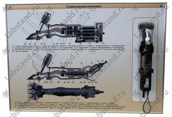 Назначение: Стенд-планшет предназначен для изучения конструкции и принципа действия стригальной машинки и её составных элементов.